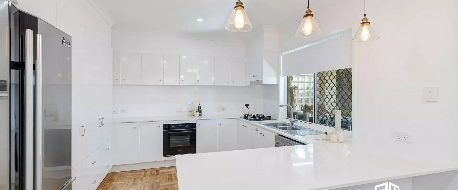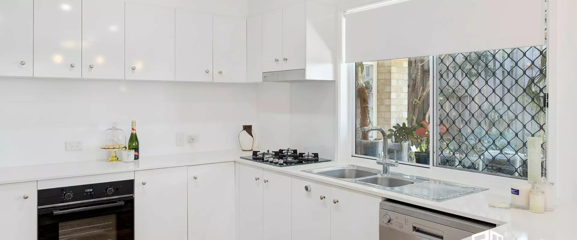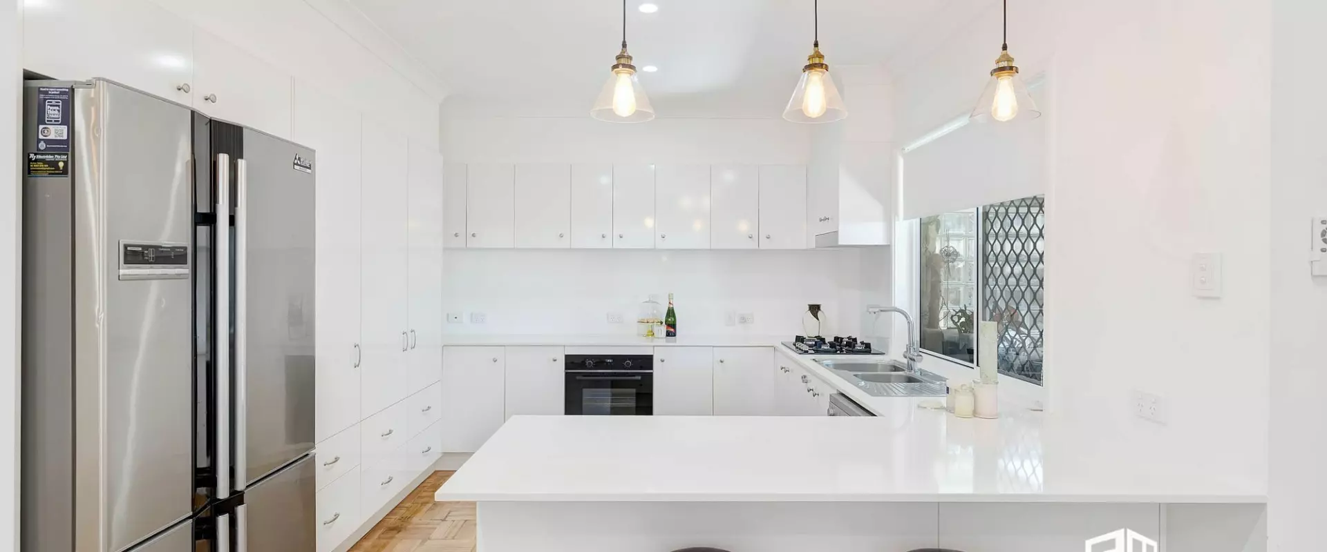 Luminous, sleek two-pack kitchen with stone benchtops